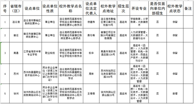 根据《省教育厅办公室关于开展高等学历继续教育自查和校外教学点备案工作的通知》(苏教办高函〔2023〕32号)要求,经校长办公会议审议通过,现将我校高等学历继续教育2024年拟备案校外教学点名单公示如下: