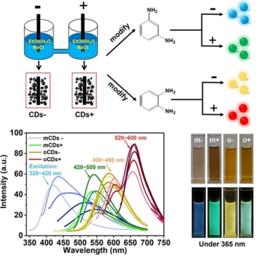 该研究采用电化学方法中的阴极和阳极氧化还原反应,调制碳点(一类新型纳米材料,CDs)的表面状态,从而在分离电极中同时获得可控荧光发射的CDs(发射范围从425 nm到665 nm)。此研究成果的发表,不仅展示了江苏省锂电池电极材料工程研究中心在碳点材料研究领域的创新能力和科研实力,也为我校在新能源材料领域的科研工作增添了新的亮点。