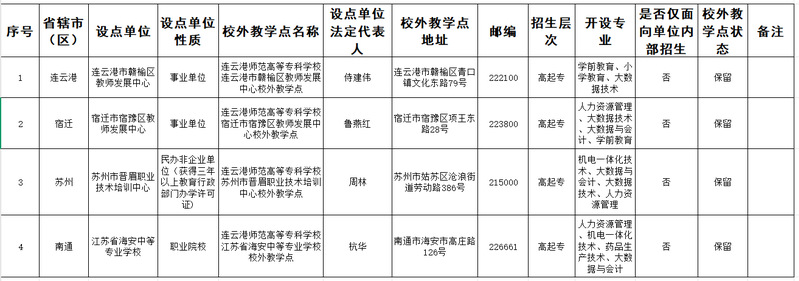 根据《省教育厅办公室关于做好2025年度高等学历继续教育专业和校外教学点设置与管理工作的通知》(苏教办高函〔2025〕2号)要求,经我校党委办公会议审议通过,现将我校高等学历继续教育2025年拟备案校外教学点名单公示如下: