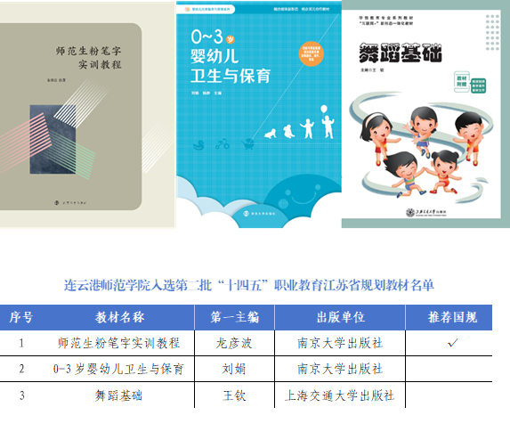 近日,江苏省教育厅发布《关于第二批“十四五”职业教育江苏省规划教材及“十四五”第二批职业教育国家规划教材江苏推荐教材的公示》,我校龙彦波老师主编的《师范生粉笔字实训教程》、刘娟教授主编的《0-3岁婴幼儿卫生与保育》、王钦老师主编的《舞蹈基础》共3本教材入选,其中《师范生粉笔字实训教程》被推荐参评国家规划教材。