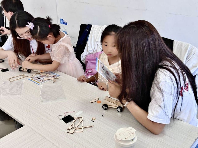 海洋港口学院“博爱青春”志愿服务队带着实验室的奇妙与课堂的智慧走进花果山街道前进村社区,和孩子们一起将书中的深奥原理转化为指尖的生动体验。“会吸水的蜡烛”揭示大气奥秘,太阳能小车展现清洁能源魅力,“水中烟花”绽放化学之美,神奇的物化实验、奇妙的科学体验在孩子们心中播撒下求知的种子,科学之美变得触手可及。志愿者们引领青少年儿童在互动中学习科学原理,培养探索精神,激发创新活力,实现智育提升。