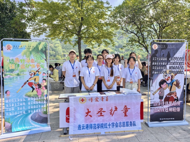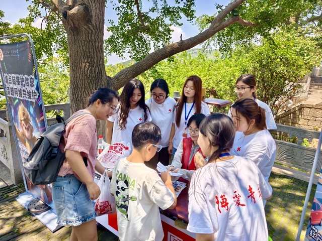 外语与商务学院(国际教育学院)“大圣护童”志愿团队在花果山景区设立“儿童安全教育驿站”,围绕防溺水、消防避险、用电安全等六大主题,通过宣传问答、情景模拟、急救法演示等形式开展安全教育。团队创新打造“西游文化IP+儿童安全教育+暑期文旅服务”模式,设计防溺水贴士、安全主题团扇、“大圣护童安全徽章”等文创产品,吸引儿童在游戏互动中学习安全知识。团队面向亲子游客开展问卷调查,助力地方文旅研学服务升级。