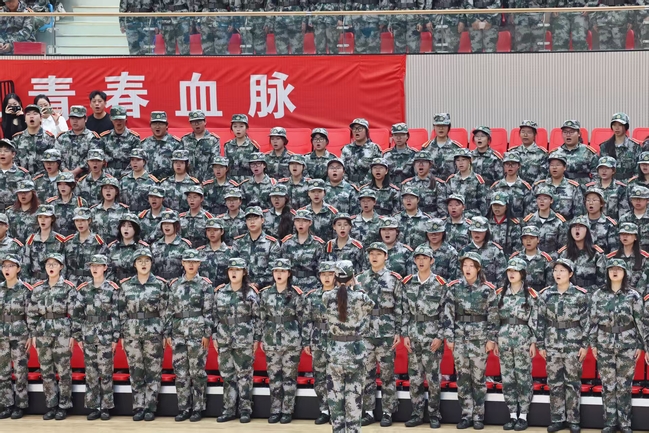 参训学生展示军训成果,合唱《强军战歌》,表达了新时代青年矢志在强国建设、民族复兴伟业中挺膺担当的坚定决心。